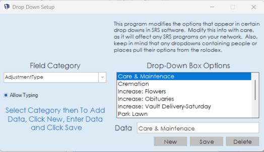 - This area allows you to customize drop down options that appear in various drop down lists throughout the program. To add or changes options, select a Field Category and type your new entry in the data box and hit save. To edit an existing entry, simply highlight the option, change the text in the data box and hit save. If a drop down contains people or places, those changes would most likely need to be made in the rolodex.