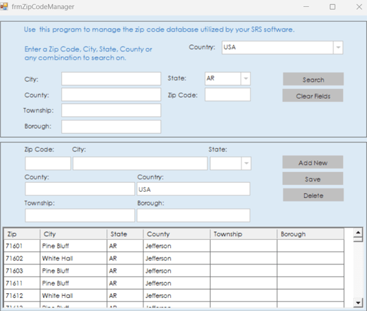 - This area allows you to adjust zip code information in the database that your SRS software uses. The top area of the window will allow you to search for zip codes based on city, county, township, borough, state or directly using a specific zip code. Zip codes and city/state information will display in the bottom area. If you need to adjust any of the information for a particular zip code, highlight the entry, edit the information and click the save button. New entries can also be added to the zip code database by clicking the "Add New" button, filling in the details and clicking save.