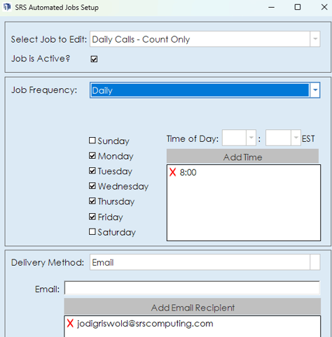 - This area allows you to setup the automated job notifications. To setup a job, select a job from the job drop down list. If the job is active make sure the active checkbox is toggled. Under job frequency, the frequency of the job can be customized using a variety of pre-defined frequencies such as daily, bi weekly, quarterly, annually and more. Under delivery method, the method of delivery can be configured. For example, if the job is to be emailed to staff members, recipient email addresses can be added to receive the job notification to their email address.