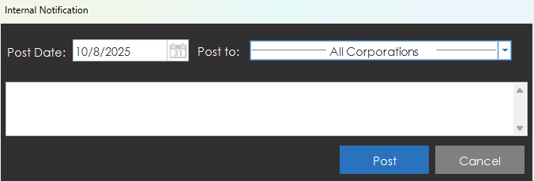 - This area gives you the ability to add an internal notification that will appear on the dashboard for users. Notifications can be posted to the dashboard for all corporations and funeral homes or to specific corporations and funeral homes.