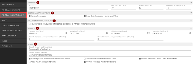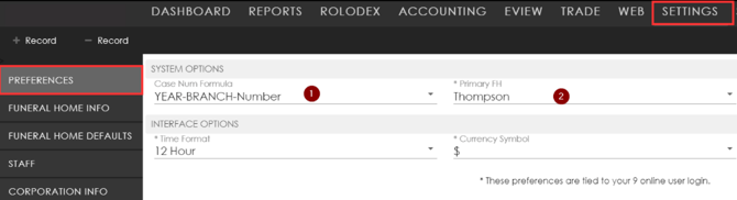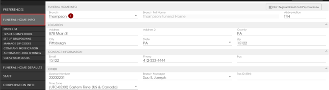 Once your Preferences are set, click on the Funeral Home Info tab. This is basic information regarding your funeral home branches.