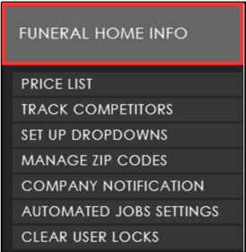 The Funeral Home Info tab will allow you to access your Price List, Set Up Drop Downs, Manage Zip Codes, and post Company Notifications on the Dashboard of the program.