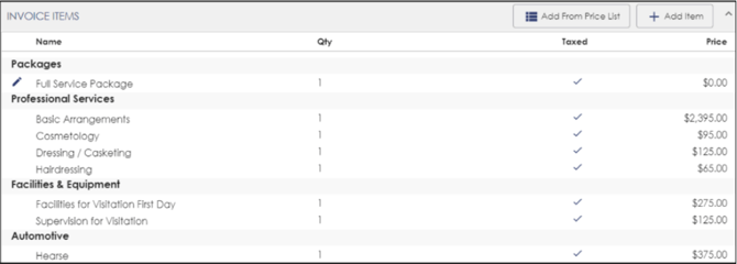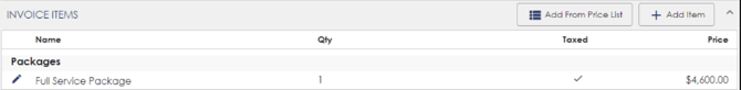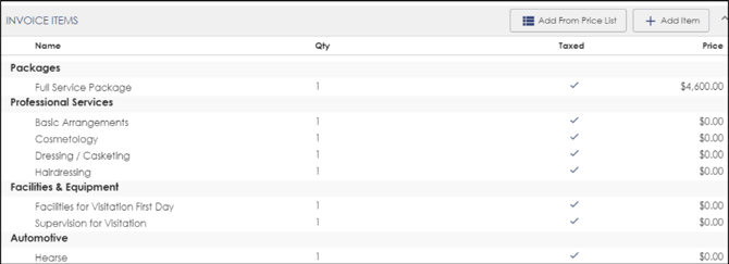 No Boxes Checked: This will display the package name and price and all of the items within the package itemed out as $0. We can format the included items as “inc.” on the Contract/Invoice if requested.