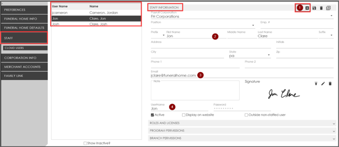 Choose whether the staff member is a Funeral Director or Embalmer by checking the boxes.
