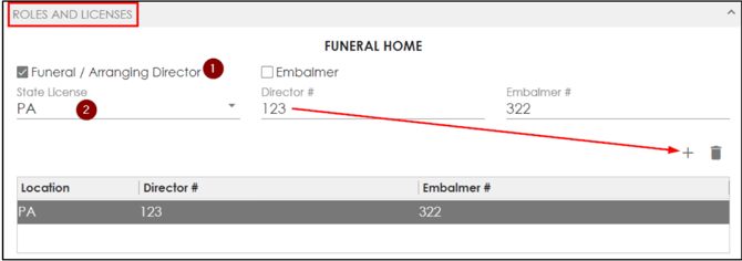 If a Funeral Director or Embalmer, enter their license numbers and click the plus icon to add a license