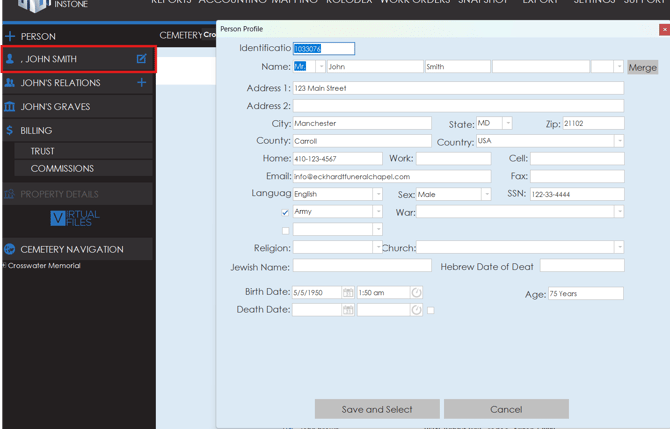 The InStone client tabs allow for information to be added to a client regarding basic client information, relations, graves and billing.