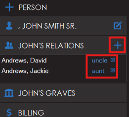 The relations tab will show any people in the system related to this person. Related people will be listed out when you click on the tab showing the family members name and relation to the person. If you need to add another related person, simply click the plus icon to add a new family member.
