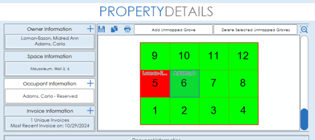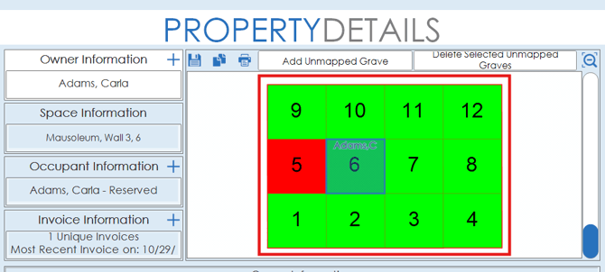 In the property details window after selecting a section from the cemetery navigation tab, plots in the section can be double clicked in the grid to add or change info regarding the owner, space, occupant and invoice information with regards to that property.