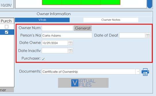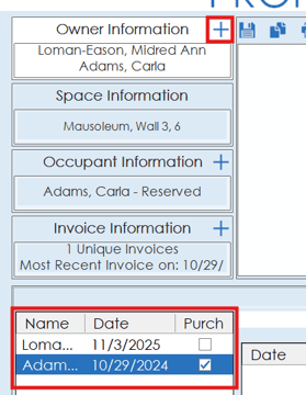 Clicking the owner information tab will allow you to edit owner information for the selected grave plot. Below the plot grid, a list of owners and owner information will be displayed. Owner number, name, date of death, date owned, date inactive, and whether the owner is the purchaser are all details that can be added.