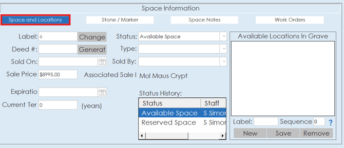 The space information tab is where details can be added or changed regarding the space location, sale, stone/marker, or work orders associated to the space.