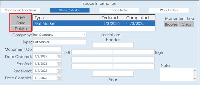 The stone/marker area is where details can be entered about the monument. Information regarding the company, type, inscription, date ordered, proof date, received date, completion date and a monument image can all be added. To add a new monument, click the new button in the upper right, use the save button to save changes to any monument information and the delete button can be used to delete monuments from the list.