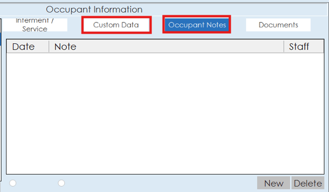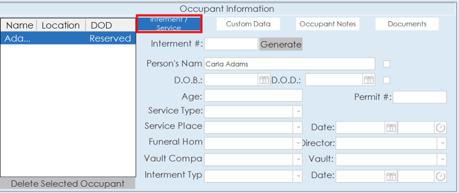 The occupant information section allows you to enter or change any details about the grave occupant. Information such as interment number, persons name, date of birth, date of death, age, service type/place, funeral home and interment information can be added.