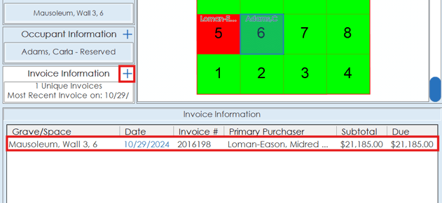Invoices can be associated to a grave plot using the invoice information tab. To add an invoice to the plot, click the plus icon on the invoice information tab. Any associated invoices will be listed out in the section below the plot grid.