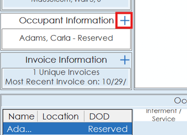 Occupants can be added to a grave plot by clicking the plus icon on the occupant information tab.