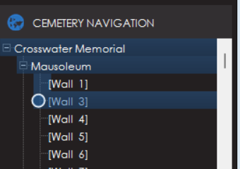 The cemetery navigation tab on a case will display a nested breakdown of cemeteries and their sections. Double clicking on a section will open the property details for that corresponding section.