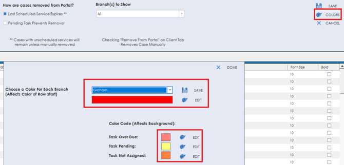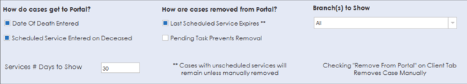 Along the top of the setup window, options are available for configuring how cases get to the portal and how cases are removed from the portal. Branches to display in the portal can be selected from the branch drop down list and a number of days can be set for how long cases will show from service date.