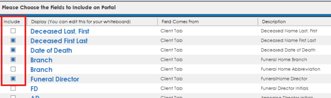 A variety of information can be selected to display in your portal view. The fields section of the setup page will list out all the available information that can be selected along with indicating where that field is coming from and a description of the field. The fields can be selected to display in your portal by checking the box under the include column.