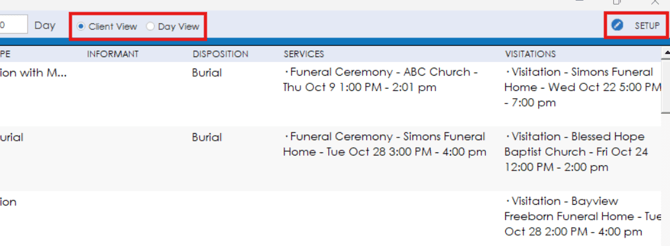 The type of view can be toggled between a client list view and a day view by the checkboxes at the top. If customizations to the portal setup are needed, clicking the setup button on the right side will take you back to the setup page.