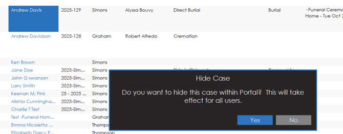 If a case needs to be hidden in the portal view, simply click on the name for the case and the hide case option will appear.