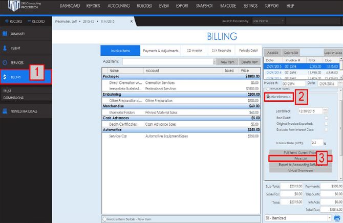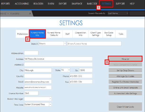The system price list is where all the pricing information for your various items, services and packages is configured. The price list can be opened two different ways. First it can be accessed through the settings page.