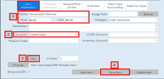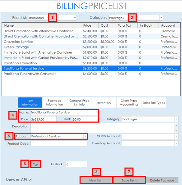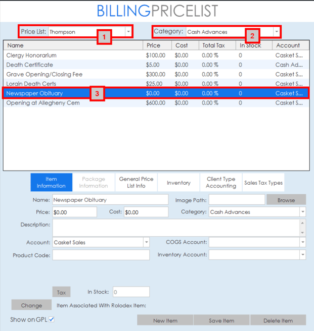 NOTE: To Add an Item click New Item and enter the information then click Save Item. To delete an item, highlight the item on top and click Delete Item.