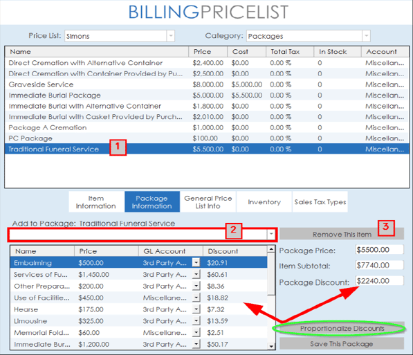 **NOTE: If the price charged doesn’t match the subtotal of the items selected, a Package Discount showing the price difference will appear. The discount will need to be proportioned over the packaged items. You may apply the discount across all items by clicking the Proportionalize Discounts button. This will add the appropriate discount to each item to balance the taxes and the correct amount if an item is to be removed from a package at purchase. You may manually apply a discount to a single item by double clicking in the discount column for the item. Individual items prices may be changed within the package to balance discounts and it will not affect the main price list. Those items prices will require manual updating in the future so they do not affect the packages though.
