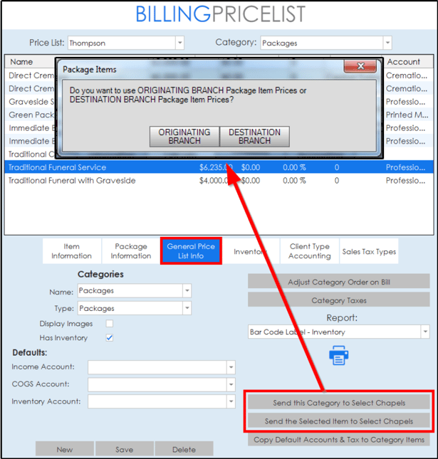 Packages can be sent to all or select chapels/branches under the Global Price List Info tab. When this is done, a message may display as below. In the case that two different branches share the same packages, but offer different pricing, you can choose to send the pricing from the ORIGINATING branch (the branch you or working out of) or keep the DESTINATION branch pricing (the branch you are sending the list to).