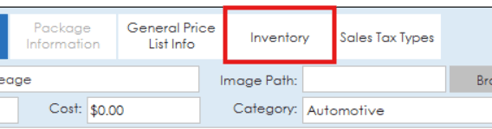 The inventory tab allows you to make adjustments to inventory information for items in your price list. Click the inventory tab on the price list page to open the inventory section.