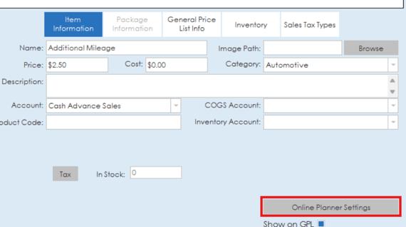Items can be configured to display in the Online Planner via the Online Planner Settings button in the price list. Once an item is highlighted in the price list, click the "Online Planner Settings" button in the bottom right.