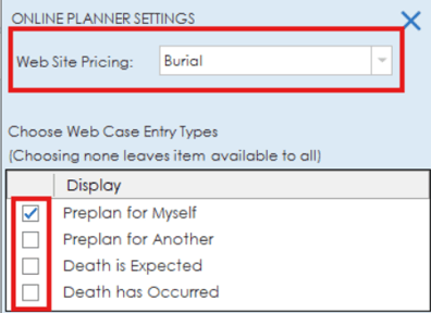 This will open up a window where the item can be customized to show only in certain types of plans in the Online Planner. Under the "Choose Web Case Entry Types" list, toggle which planning options you want this item to be visible in. This means that the item will only show up for customers who have selected one of the toggled planning types. The "Web Site Pricing" option at the top is also available to set whether this item should show up for only burials, only cremations, both options or to not show in the planner.