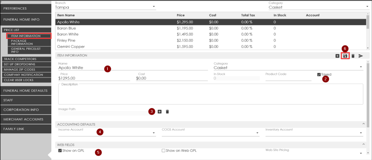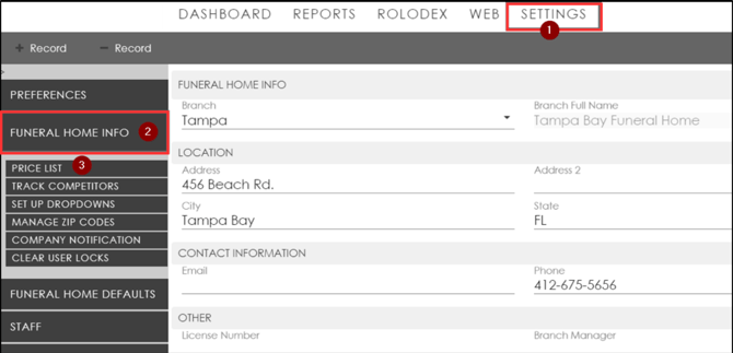 Go to the Funeral Home Info tab