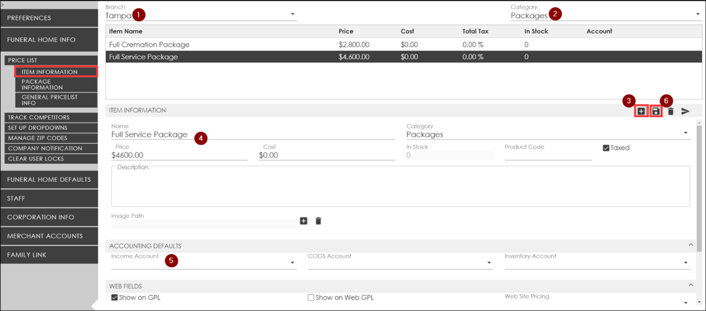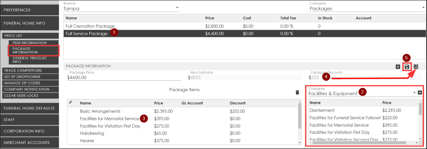 NOTE: Always verify that the items and pricing match up the same way in the other locations. If the price lists are inconsistent, certain items may need to be added to the packages to complete them.