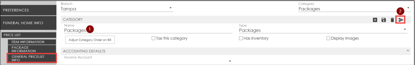To send any changes to other chapels price lists, or copy the default accounts for all the category items, click Send