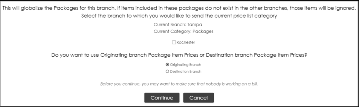 When this is done, a message will display. Select the additional branches that need the packages. There will be 2 options on how the pricing should be sent.