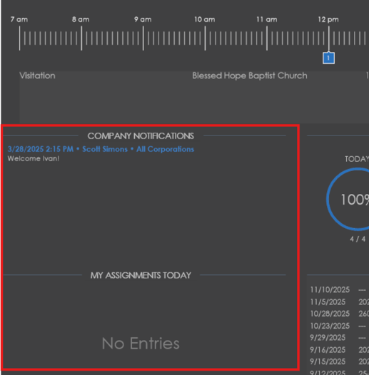 On the left side of the dashboard below the timeline, company notifications will be displayed along with any active assignments for the logged in user.