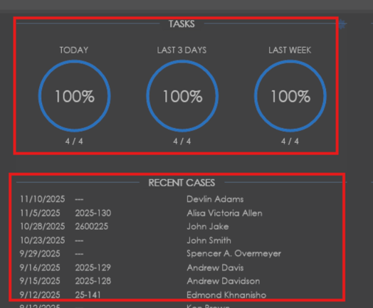 In the middle of the dashboard page, task completion metrics will be displayed and recent cases in the system will be listed out. Double clicking on any of the cases listed in the recent case section will open up the case for you.