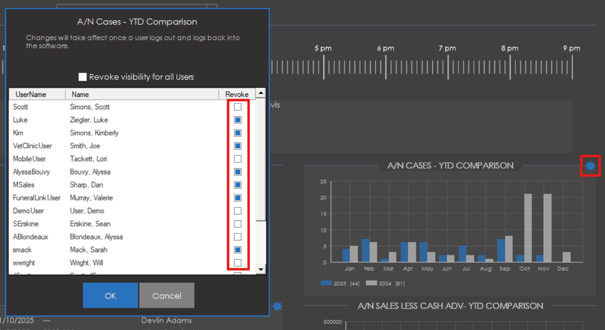 All of the sections on the dashboard can be hidden for certain users through the visibility settings. To revoke visibility on any section for a user, simply click the setting icon in the right corner of a section to toggle visibility on or off for a user.