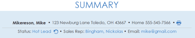 On the summary page, a client status, sales rep and contact information will display at the top of the page.