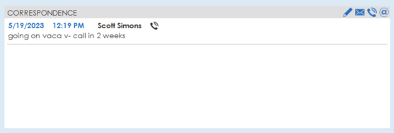 The rest of the summary page shows various components of a client at a glance. The correspondence section will show any documented correspondence with the client via email, phone call or notes left on the client. To add a correspondence entry, simply click either the pencil icon to leave a note, the email icon to record an email correspondence or the phone icon to record a phone correspondence.