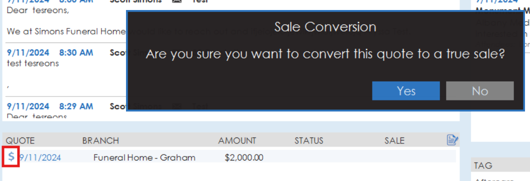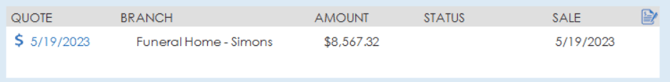 A quoted invoice can be converted to a true sale from the summary page of a client by clicking the dollar sign icon beside the quote.