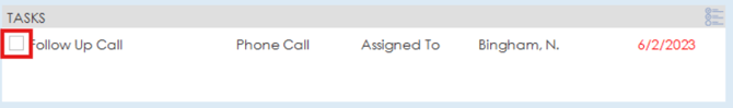 Below the quote section, the task section will show any tasks associated to this client. Just like in Procession or Phoenix, tasks can be marked as completed by clicking the toggle box beside the task.