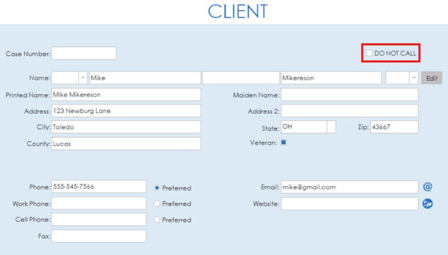 The client tab of a client record in Prospect is where basic details about the client can be added. Options are available to enter a case number, name, printed name, maiden name, address information and contact information. In the upper right corner a toggle is also available to mark the client as "Do Not Call".