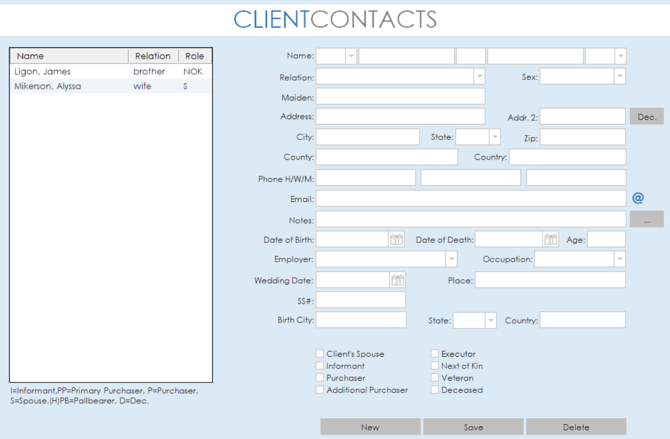 The contacts tab of the client page in Prospect is where contacts can be associated to the client. The functionality of this section is the exact same as it is on the Family/Friends section in Procession. More details on the functionality can be found on our Client Tab article for Procession.