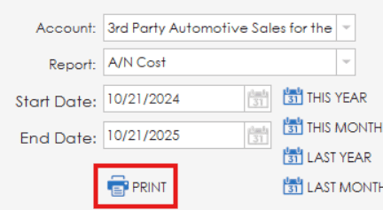 To generate a report, select an account from the accounts list, select a report from the report list and set your date range using the start/end dates. Preset date ranges for this year, this month, last year and last month are available beside the date area. Once you have all your selections made, click the print button to generate the report.