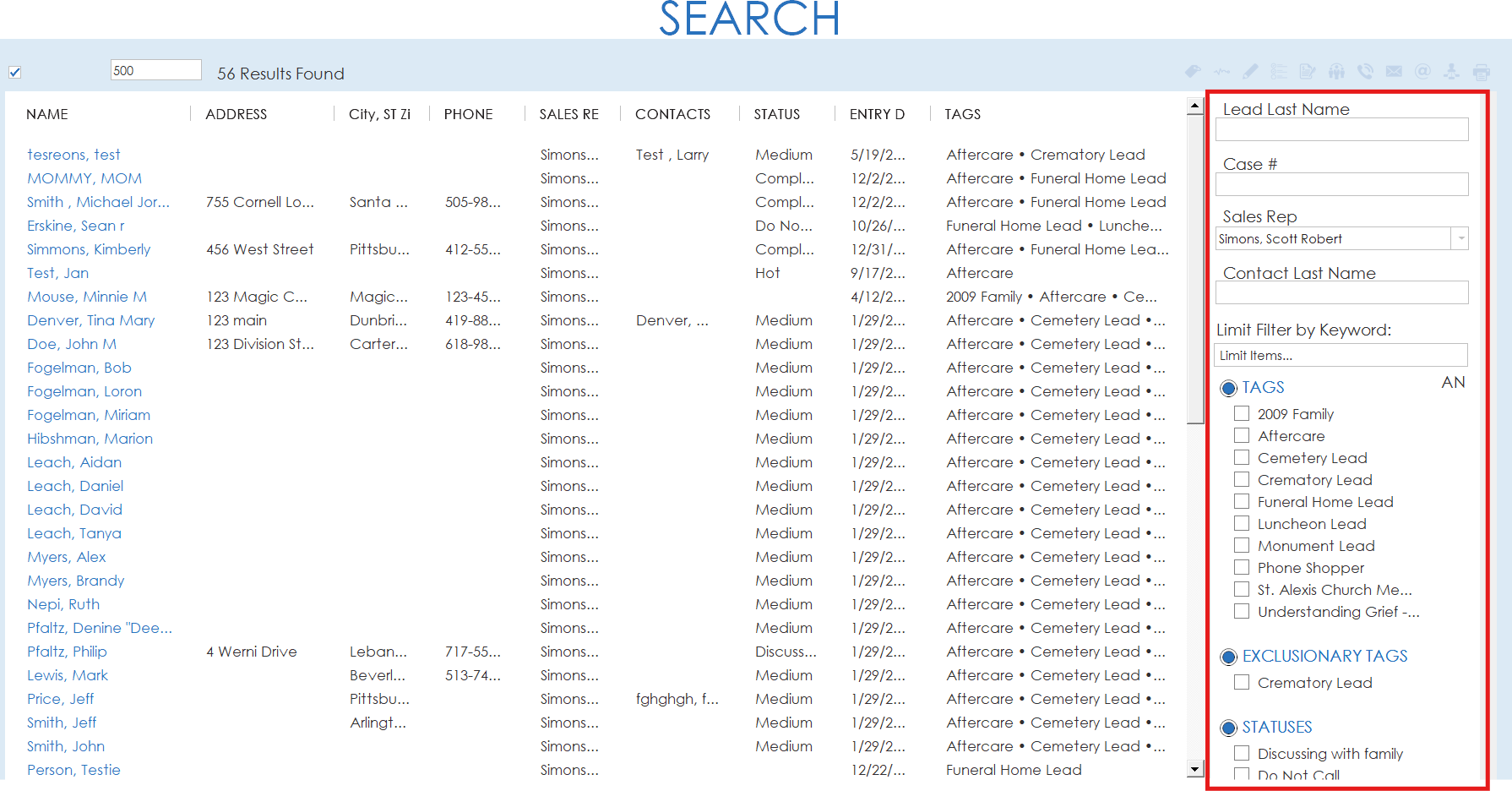 In Prospect, the case search functions similarly to the Procession advanced search except with different fields available. On the right side of the search page, search fields are listed out. Cases can be searched for by lead last name, case number, sales rep and contact last name. Cases can be also be searched for by additional fields such as tags, exclusionary tags, statuses or data fields containing date, age, address and contact info.