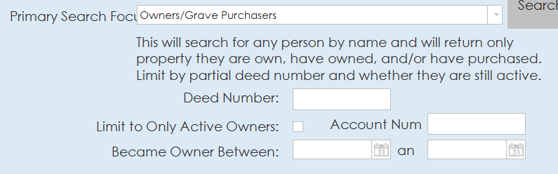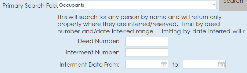 - This searches for any person by name and will only return property where they are interred/reserved. Additional options are available to limit the search by deed number, interment number or interment date.