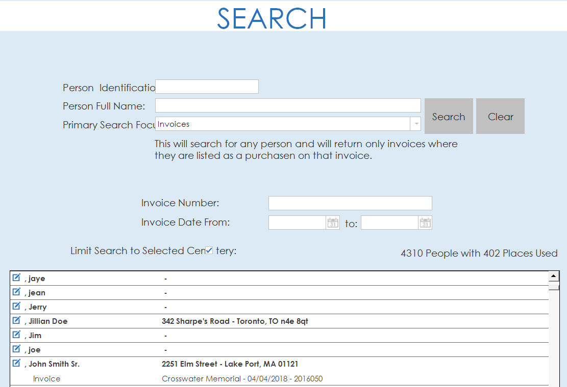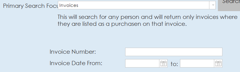 - This searches for any person and will return only invoices where they are listed as purchaser on the invoice. Additional options are available to limit the search by invoice number and invoice date range.