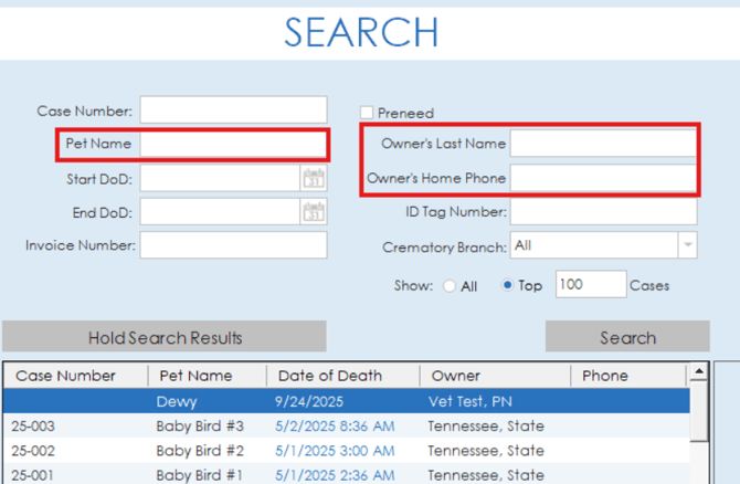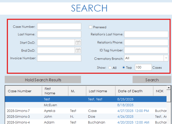 If you are using Phoenix, the case search offers a bit more of a simplified view. There are also some differences in the options available for search. Cases can be searched by case number, last name, DOD, invoice number, relation's last name, relation's phone, ID Tag Number and crematory branch.