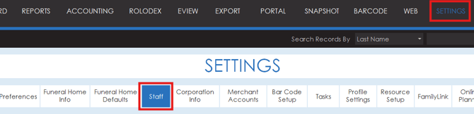 The staff tab allows for configuring information and settings regarding staff members and user accounts.