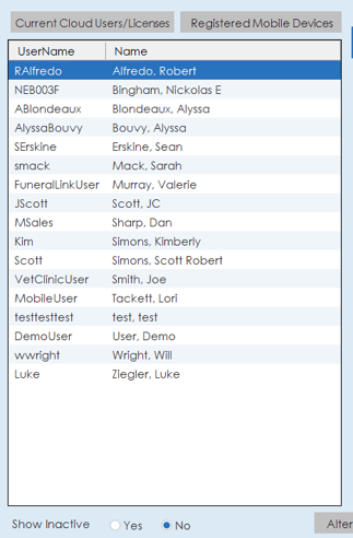 On the left side of the section a list of staff will be displayed, showing UserName and Name for each. Options are available at the top of the list to show current cloud users or registered mobile devices. A toggle is also available at the bottom of the list to show or not show inactive users.